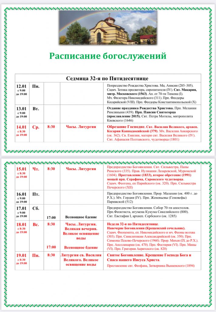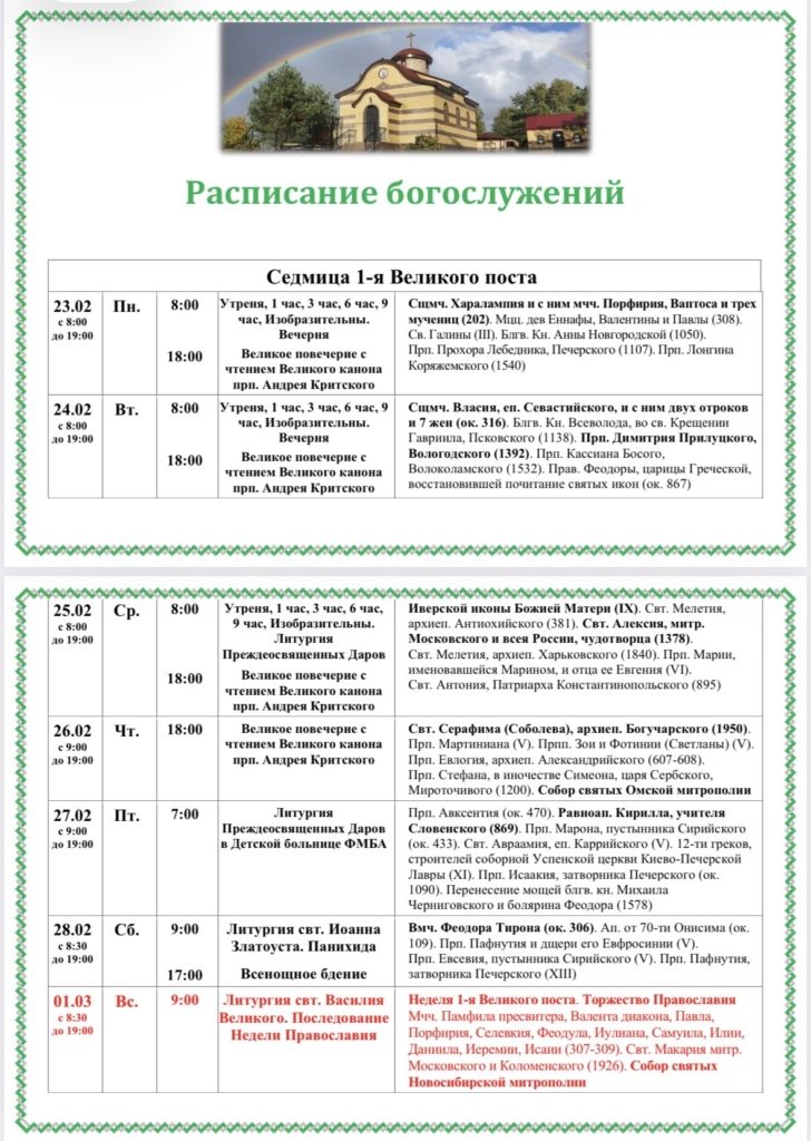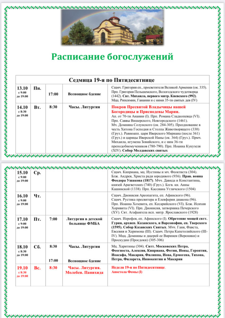 РАСПИСАНИЕ БОГОСЛУЖЕНИЙ
